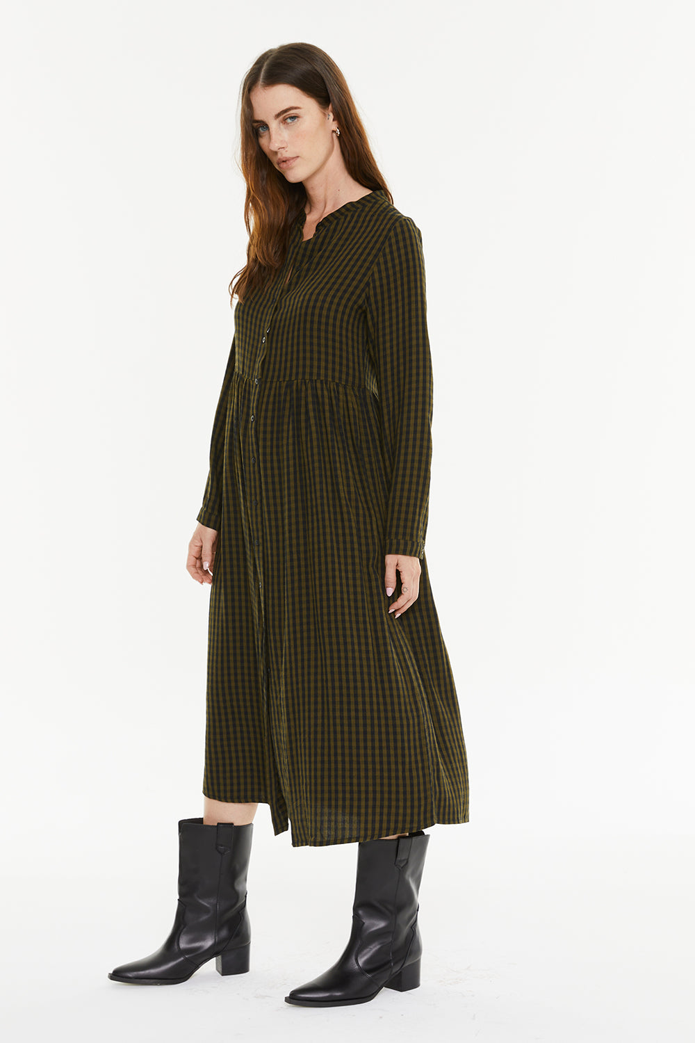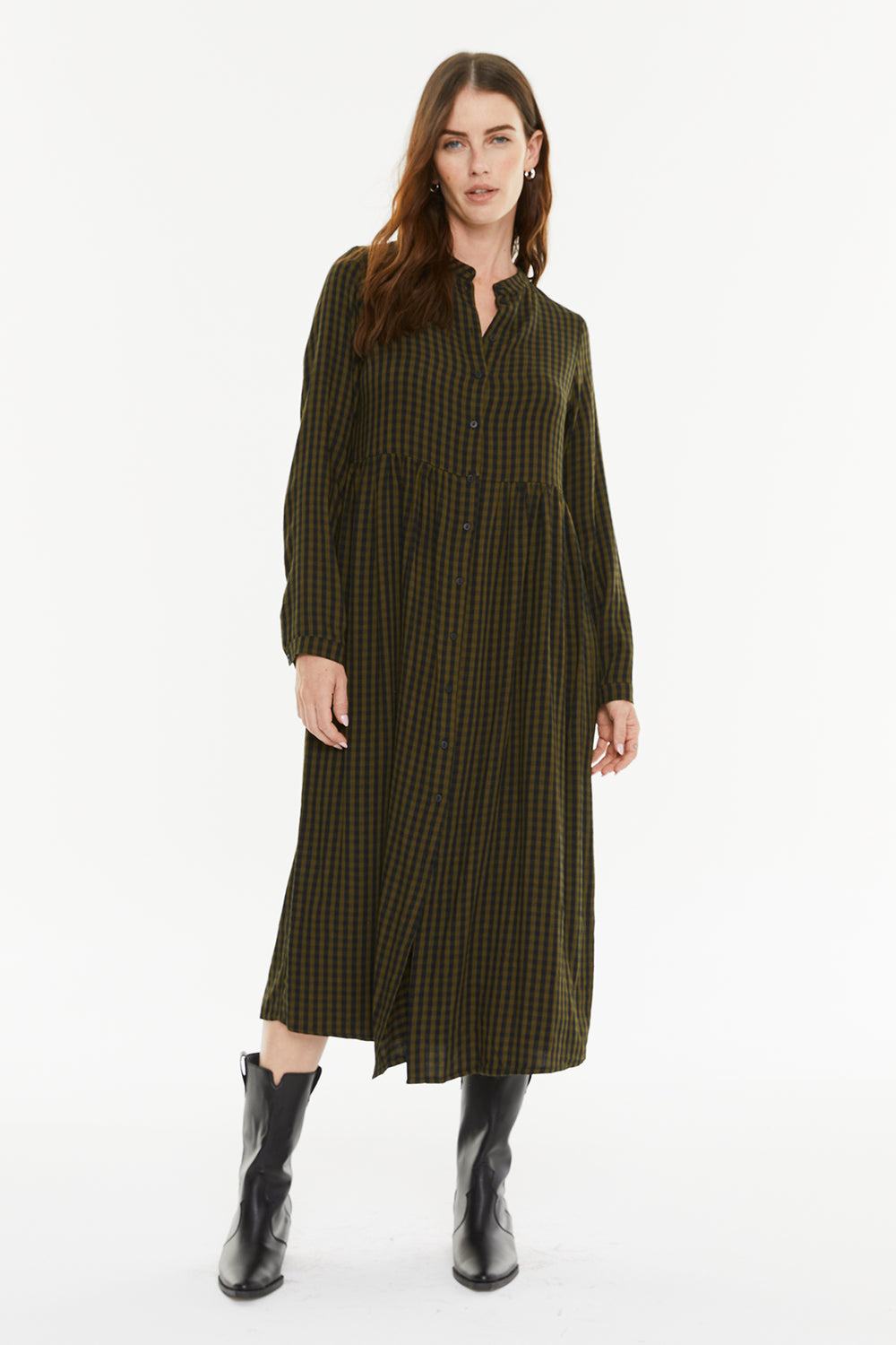 Vestido largo de mujer con tejido de cuadros, escote redondo y abotonado en el delantero. Prenda sostenible.