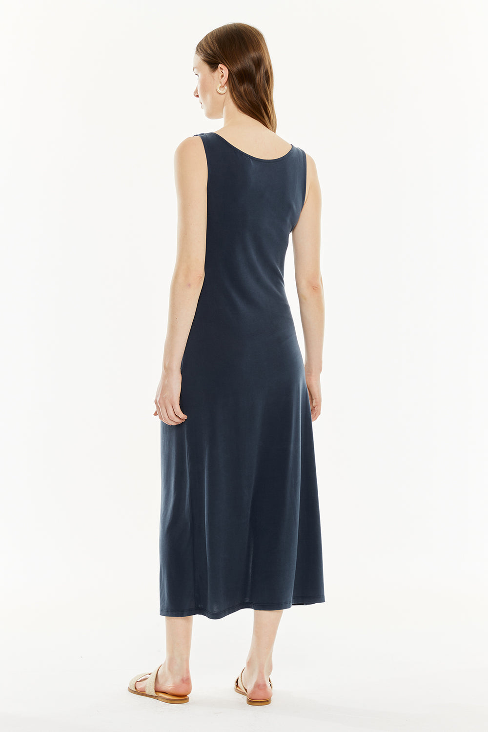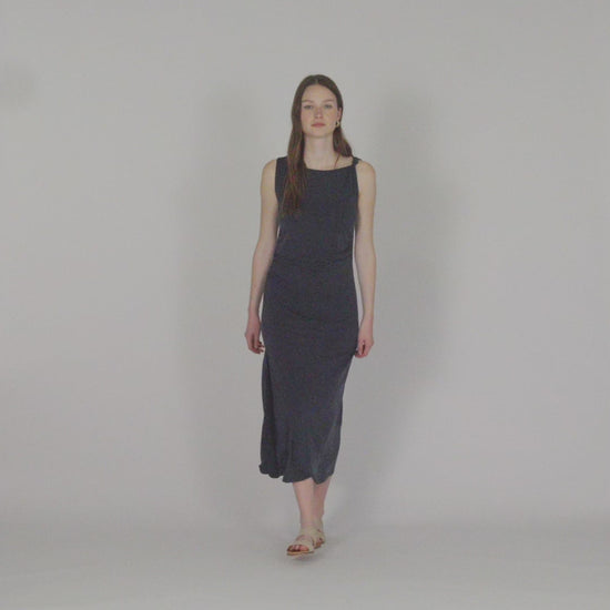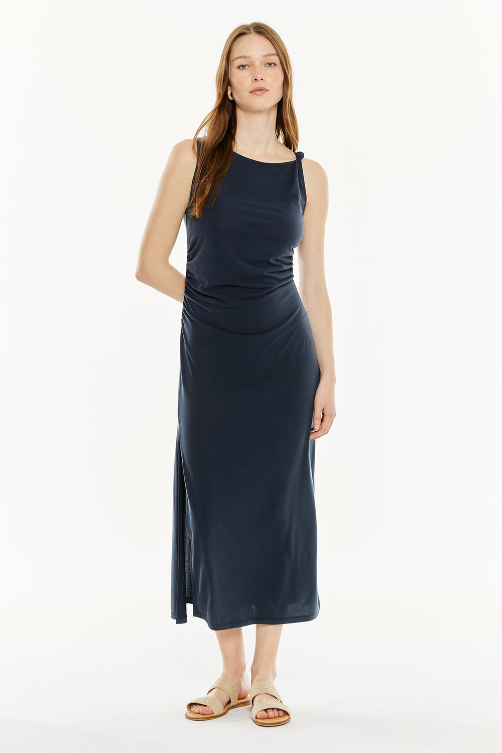 Vestido midi de mujer, con escote redondo, detalle de nudo en el tirante, frunce lateral y abertura. Prenda sostenible.