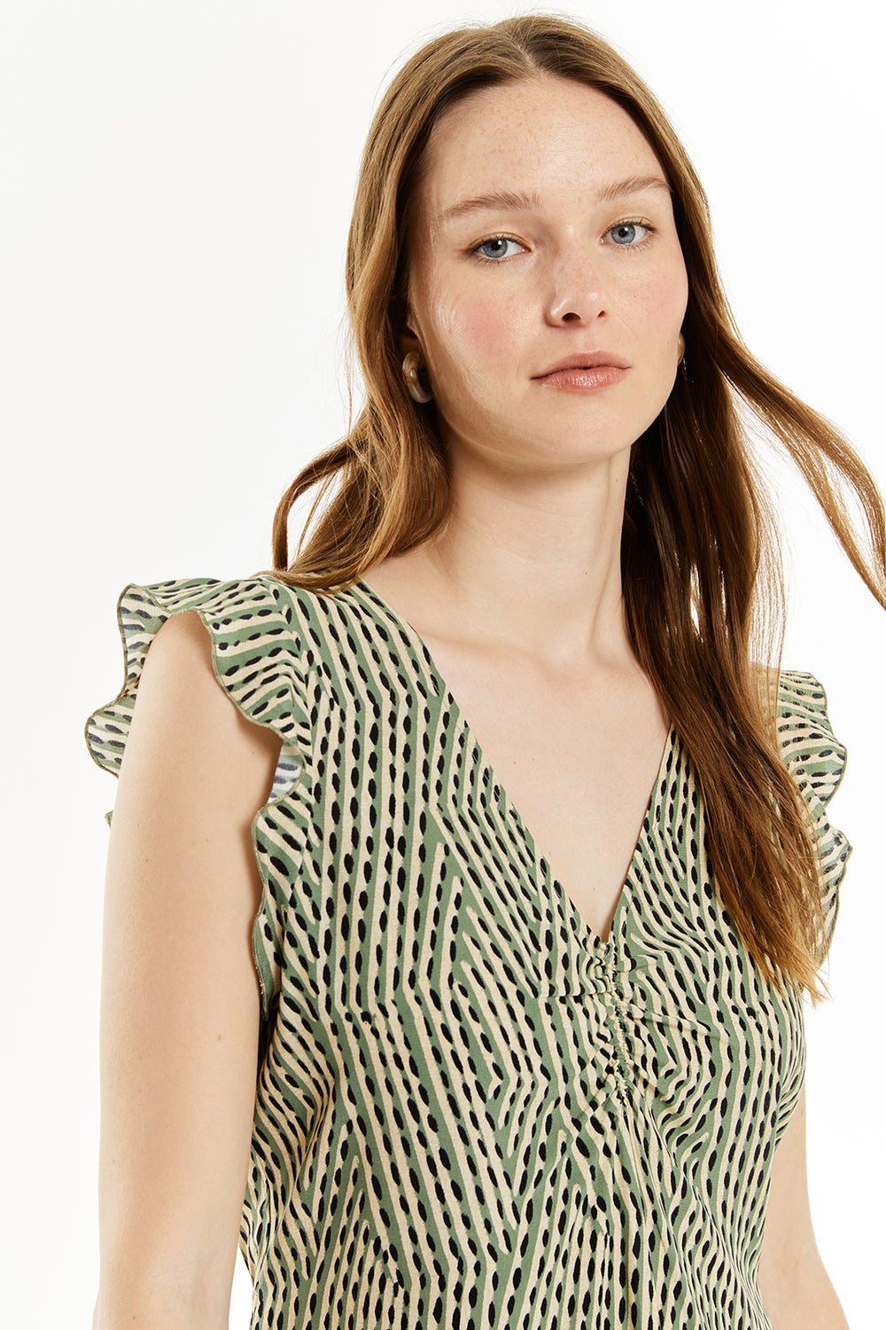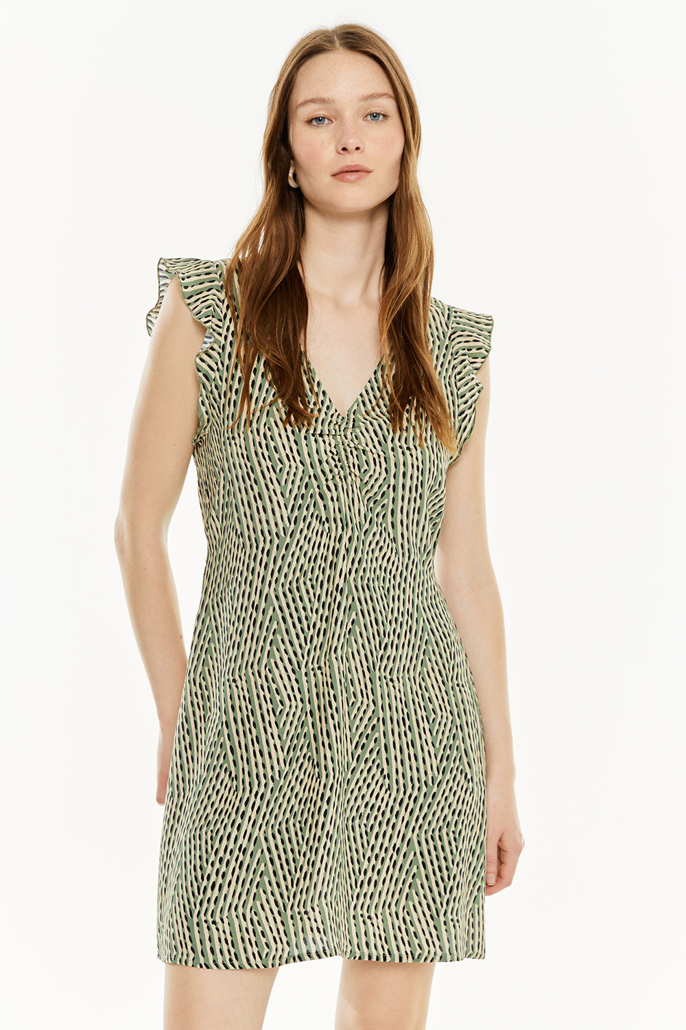 Vestido corto de mujer, estampado, escote en pico, mangas con mini volante y frunce en la parte delantera. Prenda sostenible.