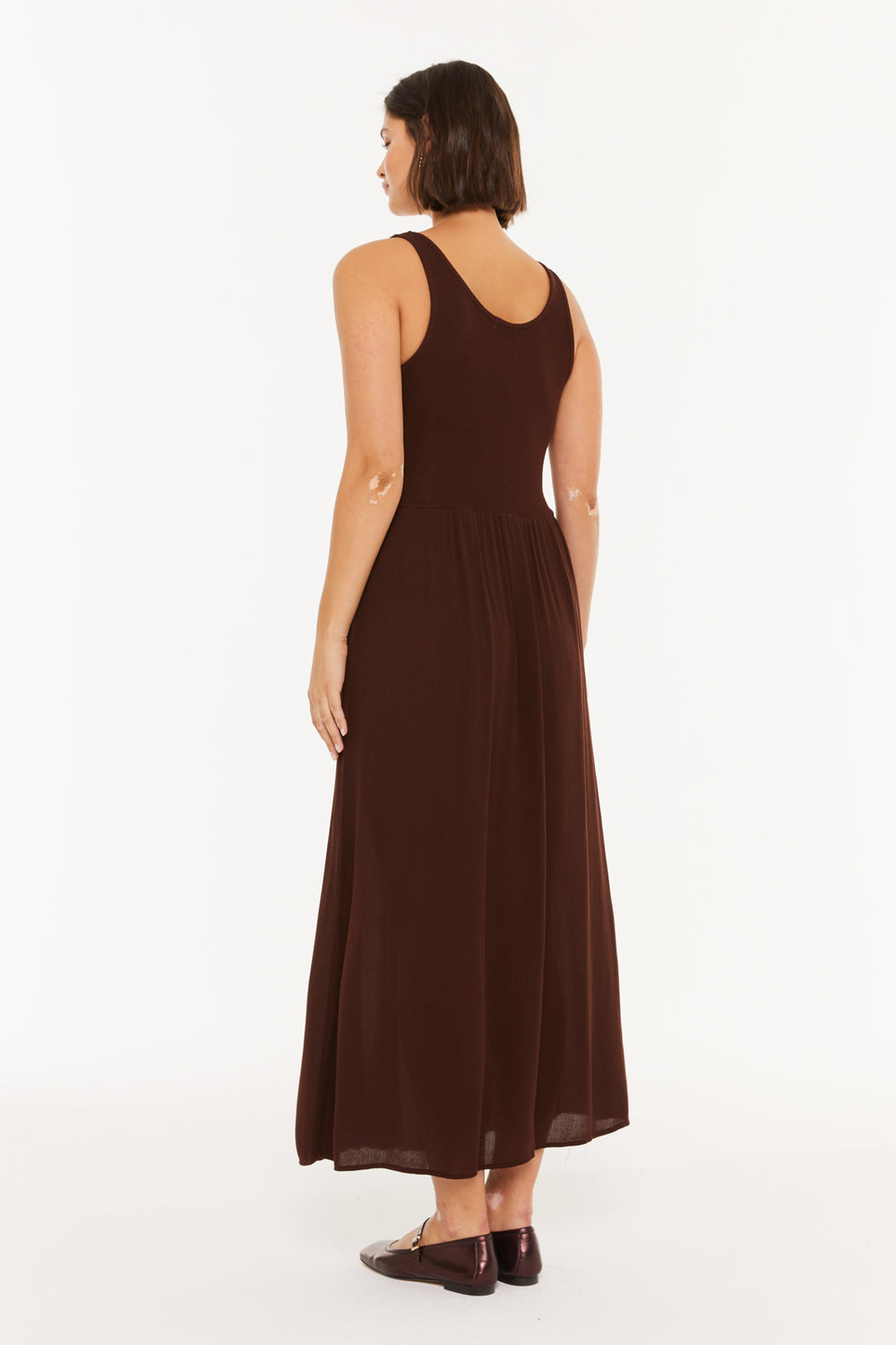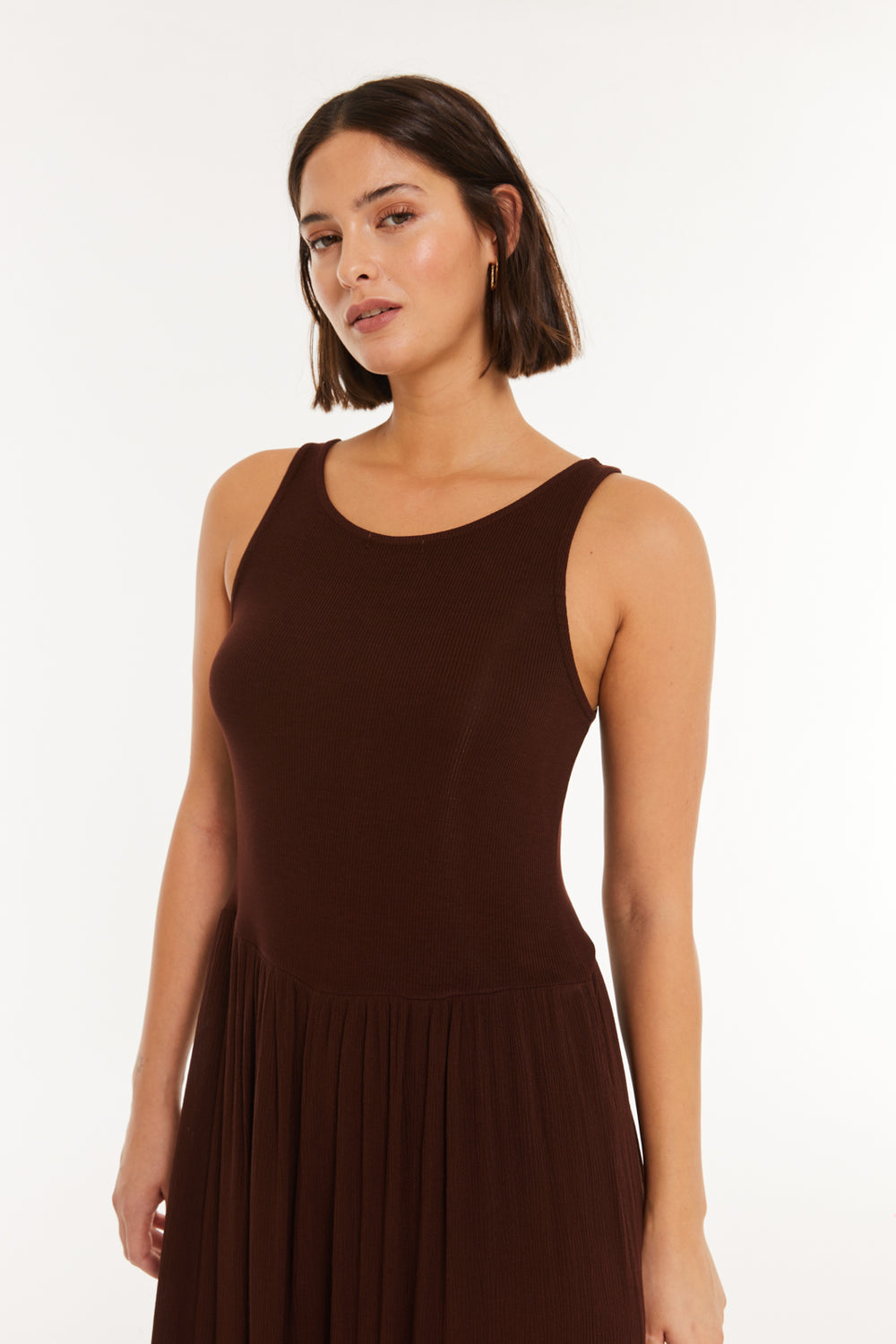 vestido de mujer largo con combinación de tejido de punto y plana, escote redondo . Prenda sostenible.