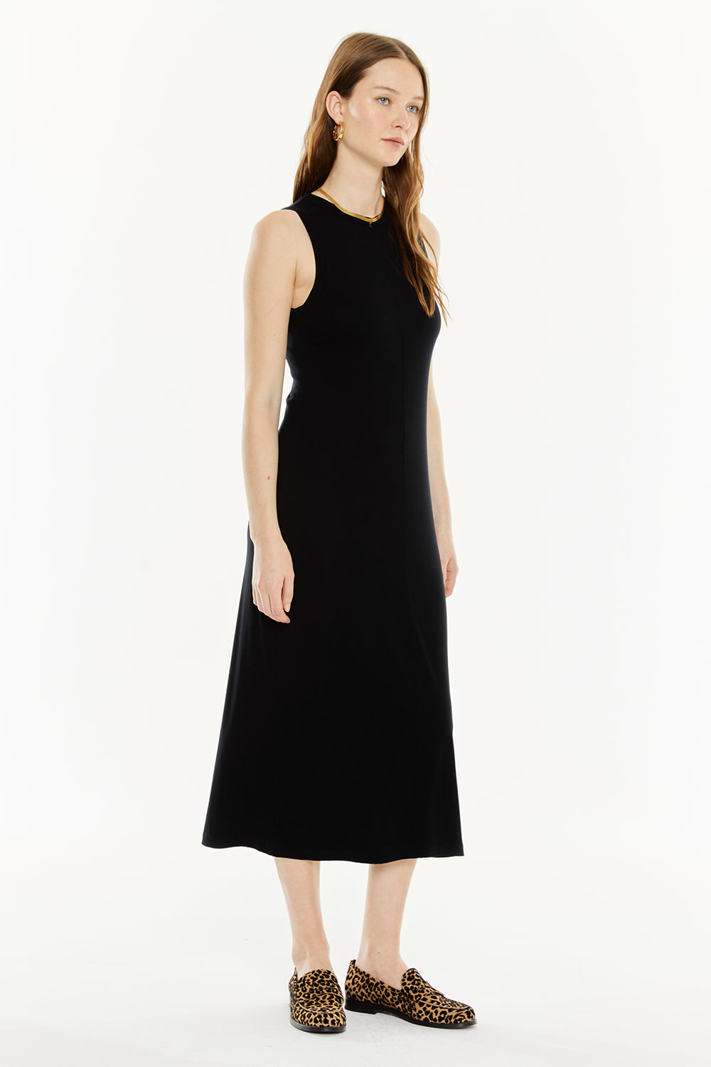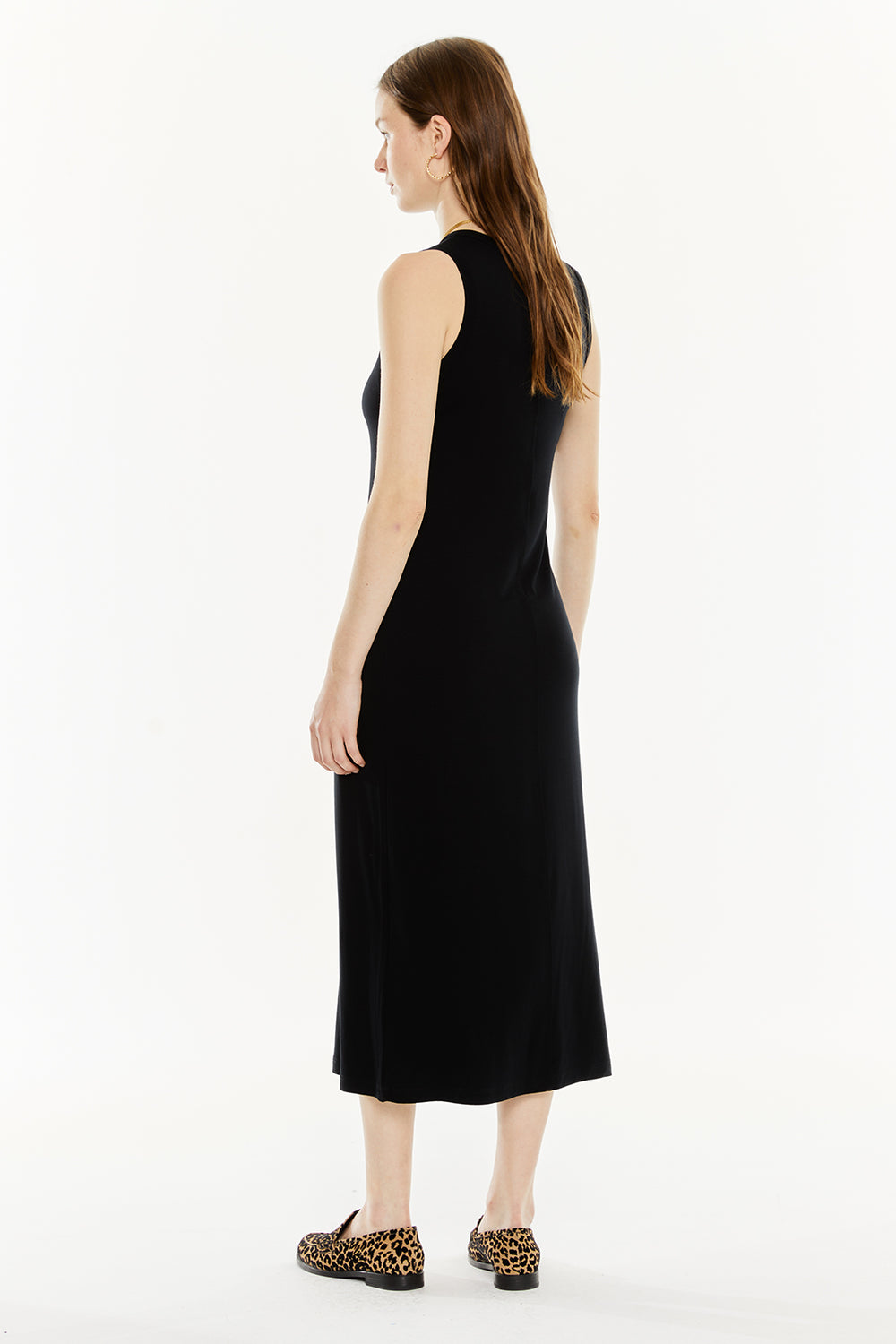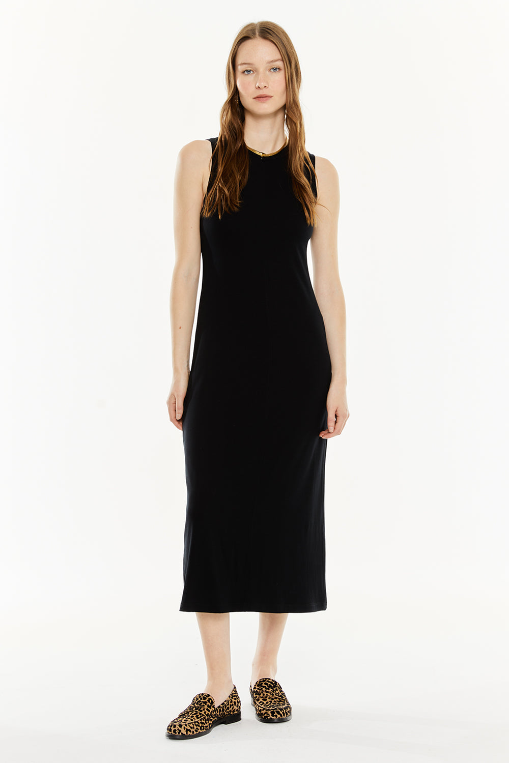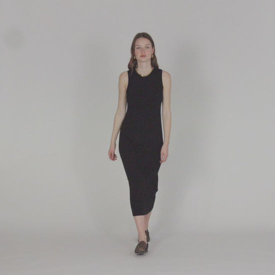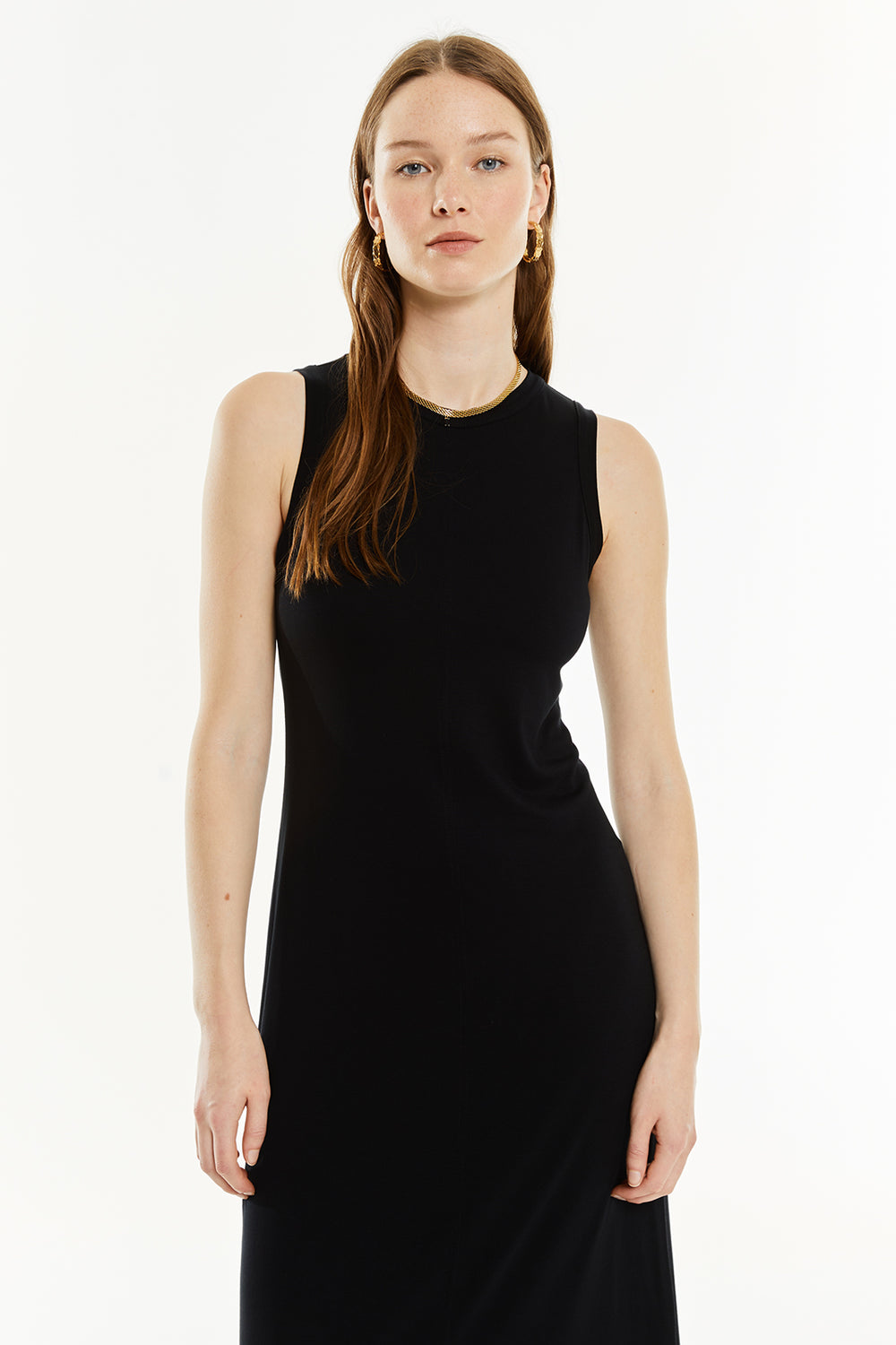 Vestido largo de mujer, sin mangas y escote redondo. Prenda sostenible.