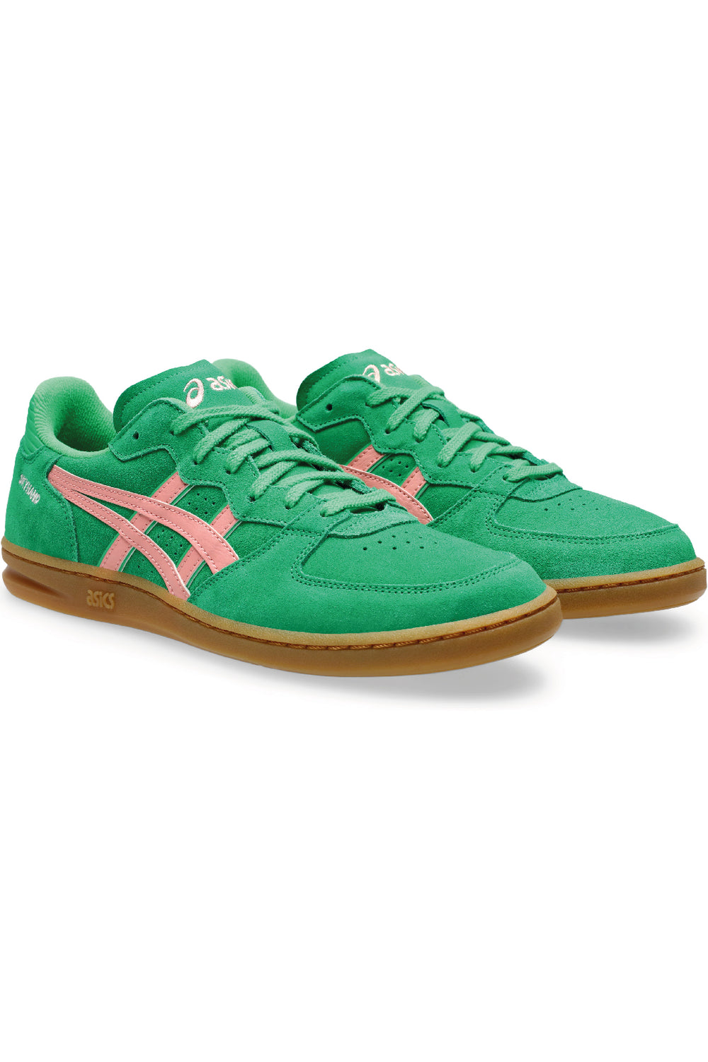 Zapatilla Asics verde y rosa modelo Skyhand OG. Cuenta con paneles de ante, suela de goma y cuña del talón con amortiguación EVA.